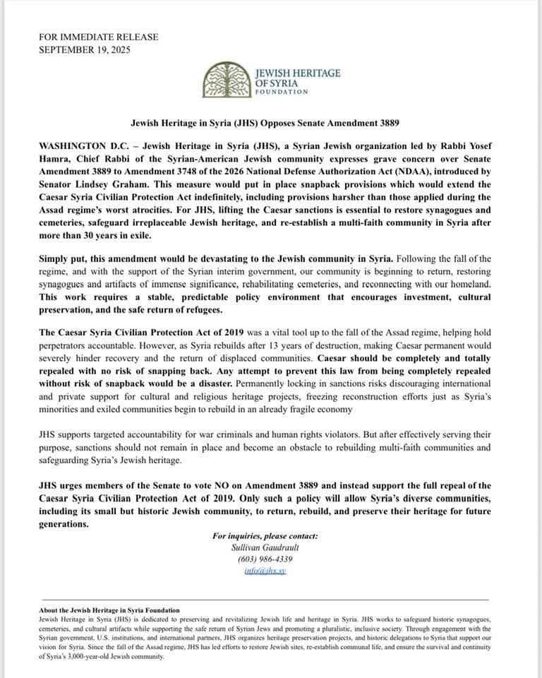 ووفقًا لما ورد ضمن البيان: "باسم التراث اليهودي في سوريا(JHS) ، أعبّر عن بالغ قلقي حيال التعديل رقم 3889 على التعديل رقم 3748 من قانون تفويض الدفاع الوطني لعام 2026 (NDAA)، الذي قدّمه السيناتور "ليندسي غراهام."